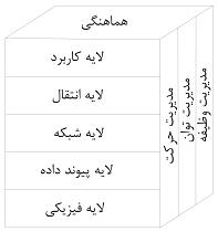 مطابق شکل زیر پشته قراردادی از یکطرف دارای پنج لایه افقی شامل لایههای فیزیکی، پیوند داده، شبکه، انتقال و کاربرد و از طرف دیگر دارای سه لایه عمودی مدیریت توان، مدیریت جابجایی و مدیریت وظیفه است.