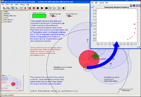 در این مثال یک مدل از منبع توان (باتری ها) گره های حسگر با یک مدل از یک سناریویی که گره های صوتی با هم برای تصمیمگیری موقعیت منبع صوت بهوسیله مثلثبندی همکاری می کنند، تزویج میشوند (شکل 11).