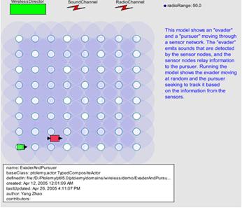 در این بخش چگونگی ساخت و اجرای مدل هایی از شبکه های حسگر بی سیم را بررسی مینماییم. این یک مدل ساده شده از یک سیستم متمرکز صوتی است که در آن از میدانی از گره های حسگر استفاده می کند که یک صدا را شناسایی و به وسیله پیام رادیویی به مرکز گزارش می کند تا موقعیت صدا را مثلث بندی کند. شکل 8 نشان می دهد که این مدل شامل حسگر بیسیم، دو مدل کانال (یک مدل کانال رادیویی و یک مدل کانال صوتی) یک تعدادی یادداشت (متون شرح دهنده مدل) و عاملهایی در مدل است.